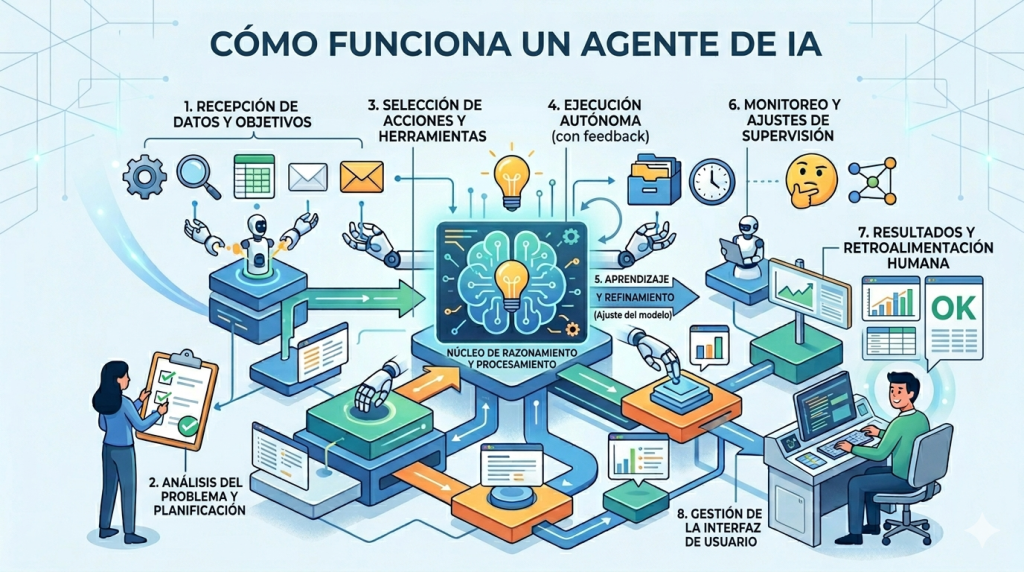 El funcionamiento de un agente de IA suele seguir un bucle bastante reconocible: recibe una meta u objetivo, analiza el contexto disponible, decide qué acción ejecutar, usa una herramienta si hace falta, evalúa el resultado y repite el ciclo hasta completar la tarea, detenerse por una regla o pedir supervisión humana.