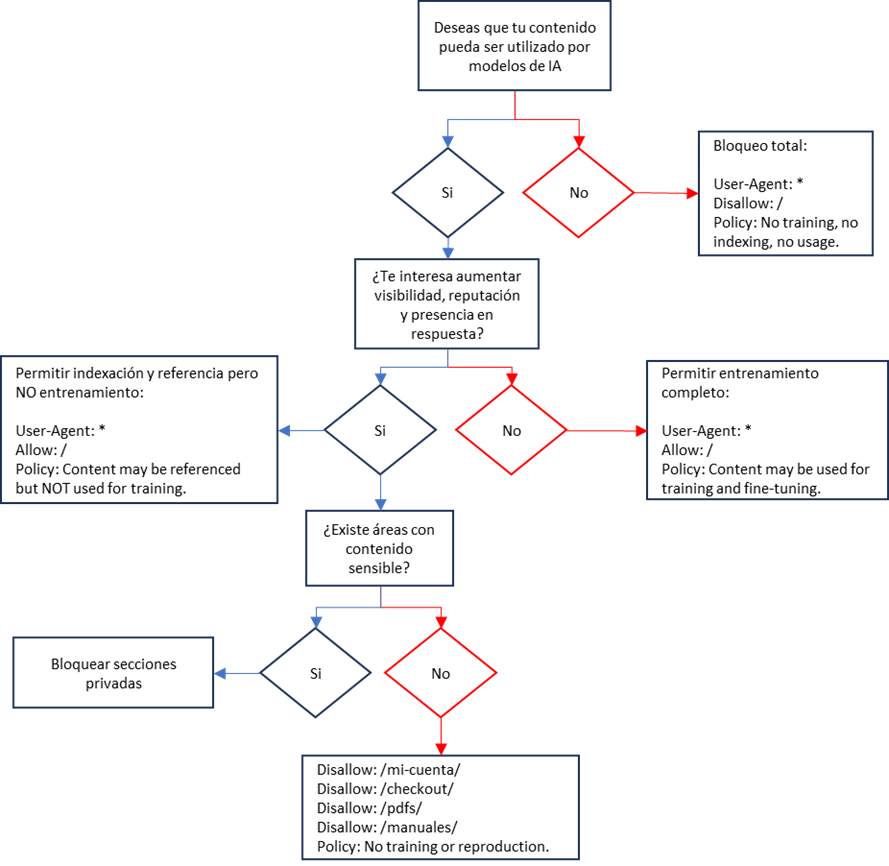 Si no tienes claro si tu contenido debes bloquearlo o no para los modelos de IA, ya sea para el entrenamiento o para su indexación, aquí te dejamos unas indicaciones claras sobre qué hacer en cada caso: