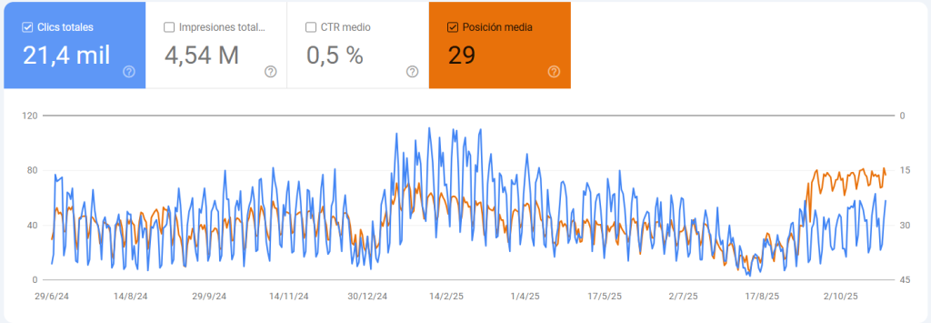 Aunque todavía queda recorrido, vemos como esta página ha pasado de posición media 32, a posición media 31,4 para finalmente recuperar la posición 27,8 en cuestión de 3 semanas.